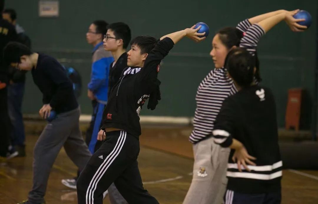 2、双手持球,将球经头上方向后掷出。注意,在投掷过程中,运动员的双脚不得超越起掷线后缘。