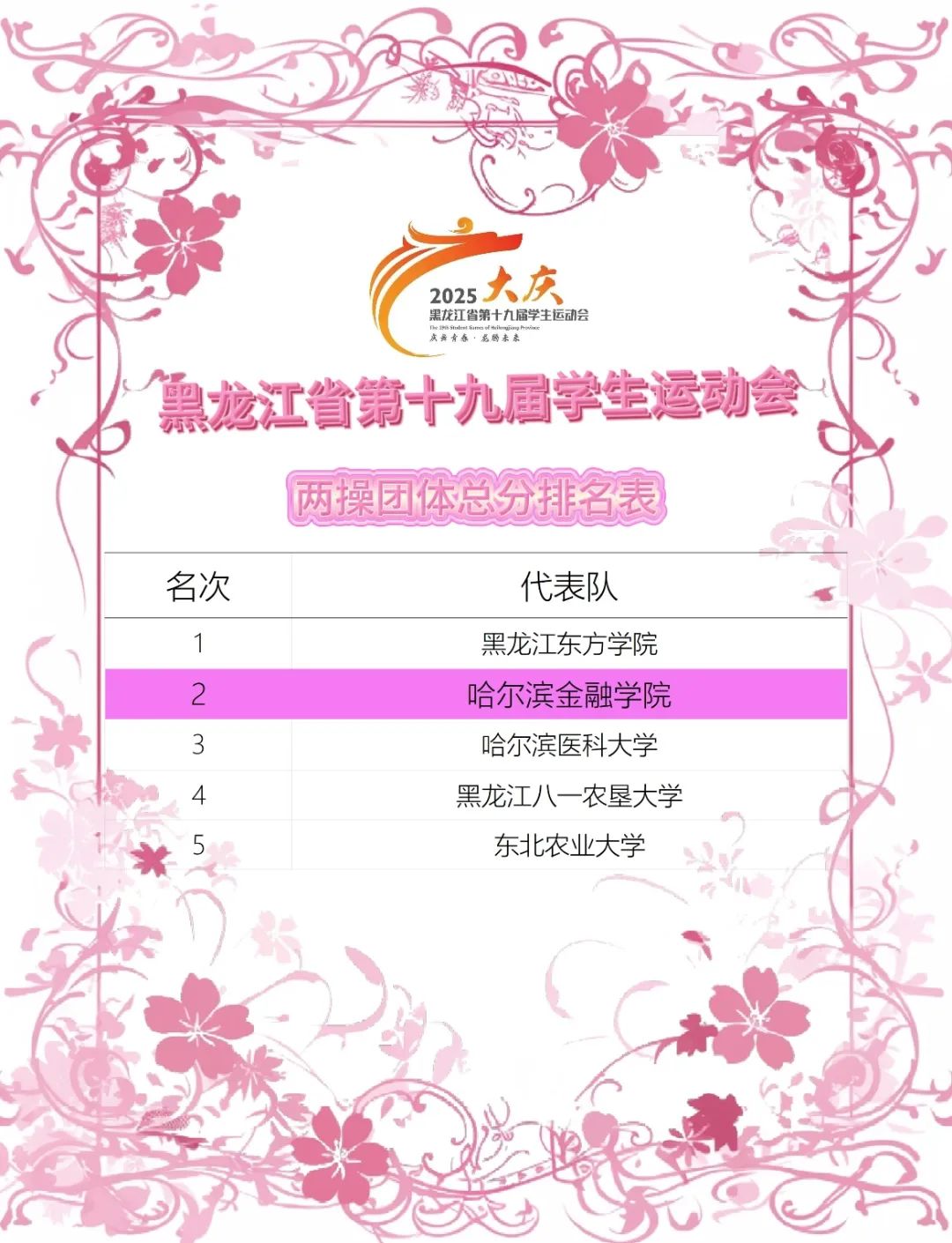 黑龙江省第十九届学生运动会战至第五日,哈尔滨金融学院代表团再次迎来载入史册的荣耀时刻!今日最大焦点莫过于男女足球队史无前例双双杀入四强,创造了历史性突破!与此同时,健美操队艳惊全场,在混合双人操项目上再夺银牌,并勇夺团体总分亚军!金院健儿用不懈的拼搏,在龙江赛场持续书写着属于自己的传奇!