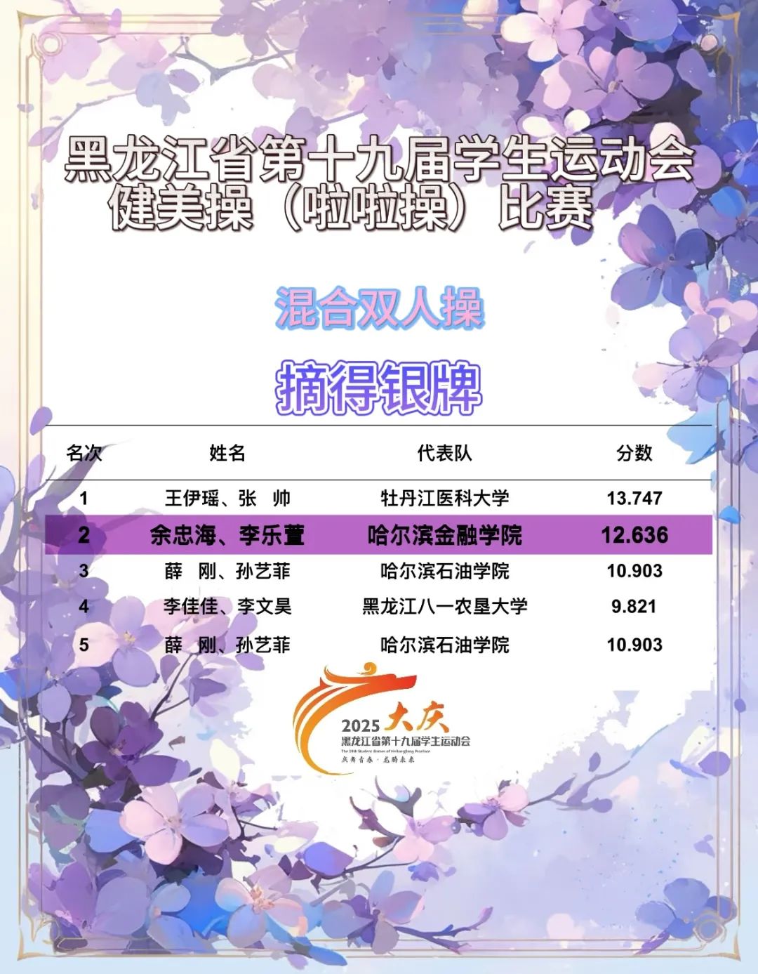 在竞争激烈的混合双人操决赛中,我校组合余忠海、李乐萱配合默契,技艺超群。以高难度的托举、流畅的衔接、富有感染力的艺术表现,征服了全场,最终勇夺一枚宝贵的银牌。