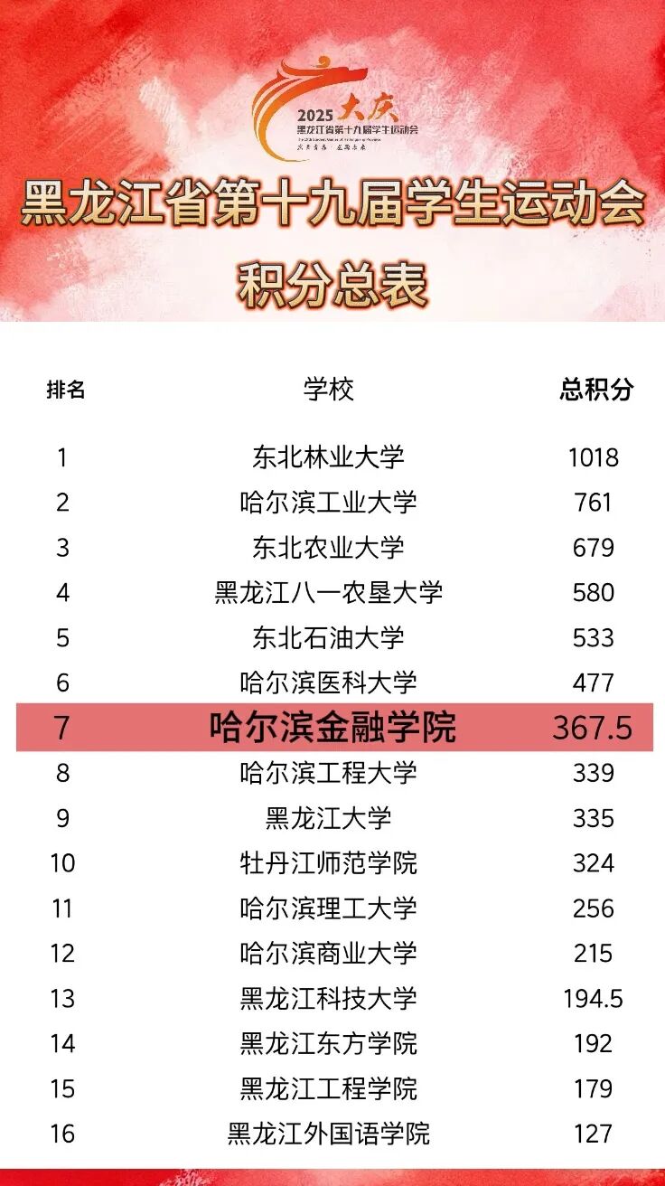 黑龙江省第十九届学生运动会征程圆满落幕,金院载誉凯旋!硝烟暂歇,荣光永驻。值此承前启后之际,为铭刻拼搏足迹、传扬赛场精神,特推出此收官专栏。此间,我们将重温夺牌时刻,致敬幕后付出,更将信念与斗志熔铸为前行薪火。金院荣耀,永不落幕!
