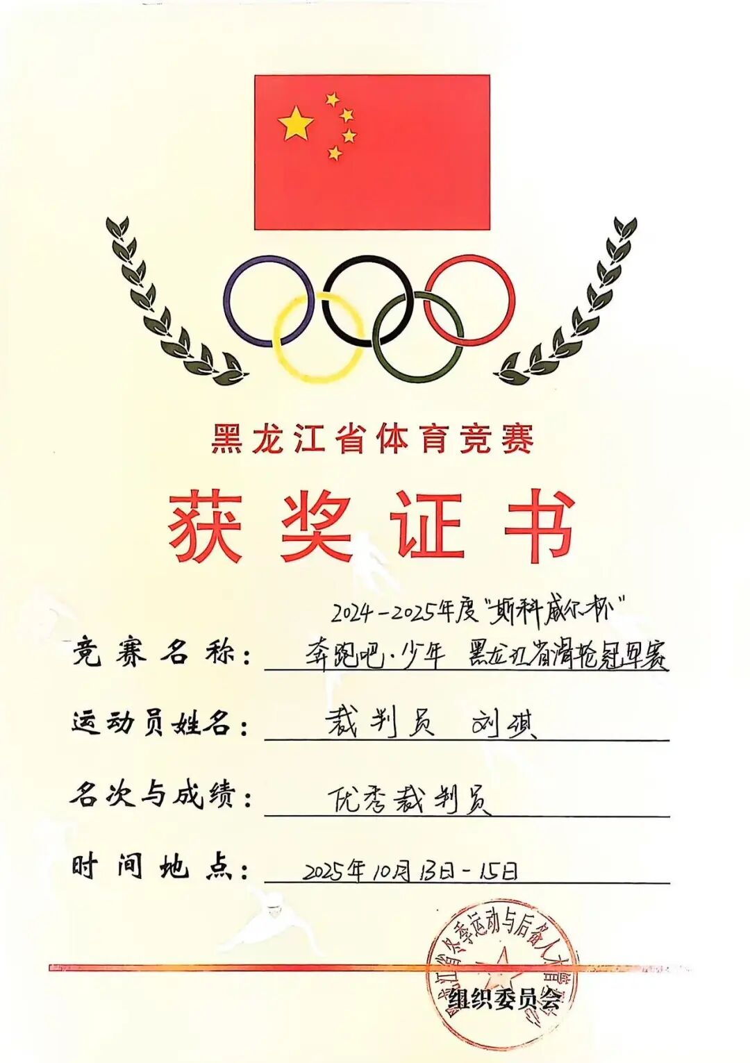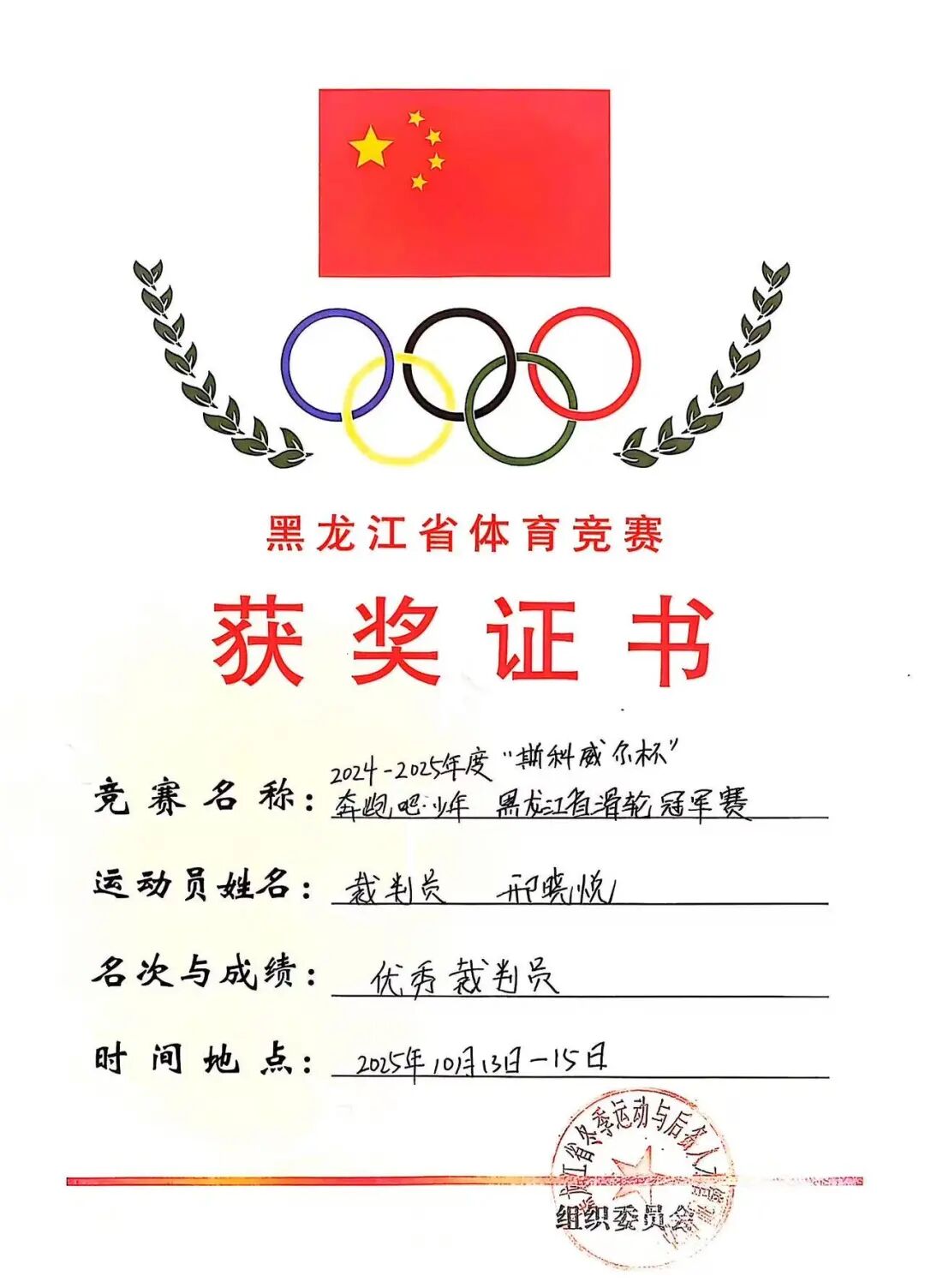 赛事组委会对哈金院师生团队的职业素养与协作精神给予高度评价,授予邢晓悦、刘琪“优秀裁判员”称号,并肯定学校冰雪人才培养创新模式。