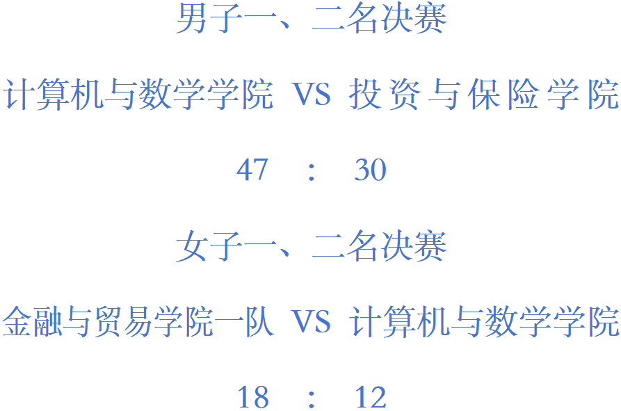 比赛正式开始,计算机与数学学院展开了二三联防,进而落入阵地防守态势。投资与保险学院的进攻未能奏效,球权随即落入计算机与数学学院手中,2号付辰致使对方犯规,两罚中一,成功拿下首分。对方3号梅丁文凭借快攻斩获分数,刘纬以及张耀坤各自投进一记三分,紧紧咬住了比分。对方识破了战术,多次进行抢断并转换进攻得分,计算机与数学学院即刻转换为盯人防守,在中场取得了两分的领先优势。下半场,17号丁占锋进攻表现神勇,但陷入到犯规问题当中,91号陈卓异替补上场后强硬打进一记2加1,并且多次致使对面进攻出现失误。投资与保险学院的刘明洋通过三分和快攻拉近了比分,11号张耀坤迅速回应一记三分。在最后一节,计算机与数学学院的进攻找到了节奏,刘纬里突外投,迅速将比分拉开。莫少聪、付辰、张耀坤在中场进行逼防,抢断数球,彻底打破了对面的追分希望。最终,计算机与数学学院以47比29战胜投资保险系,成功赢得了冠军!