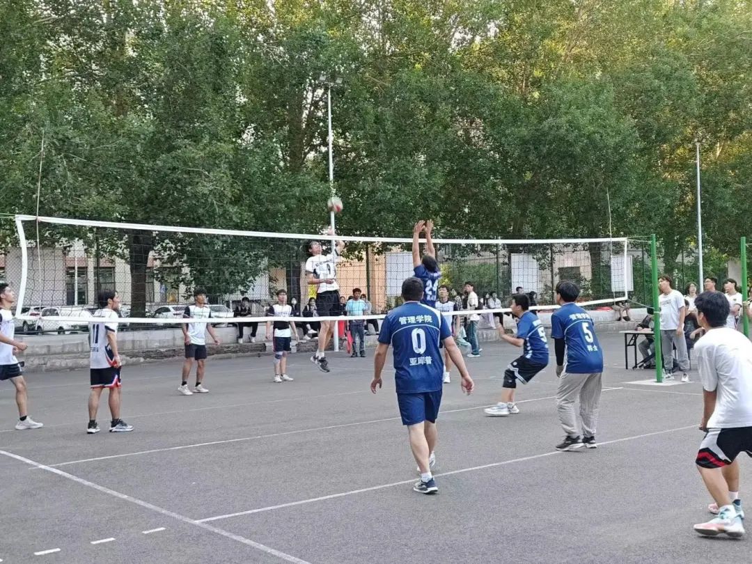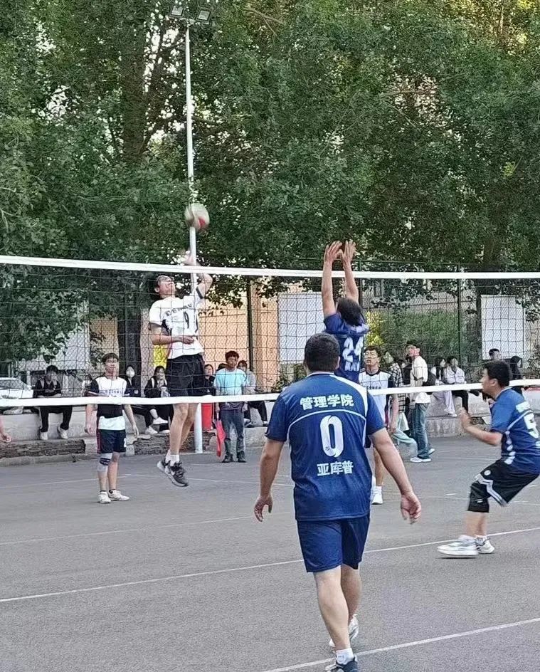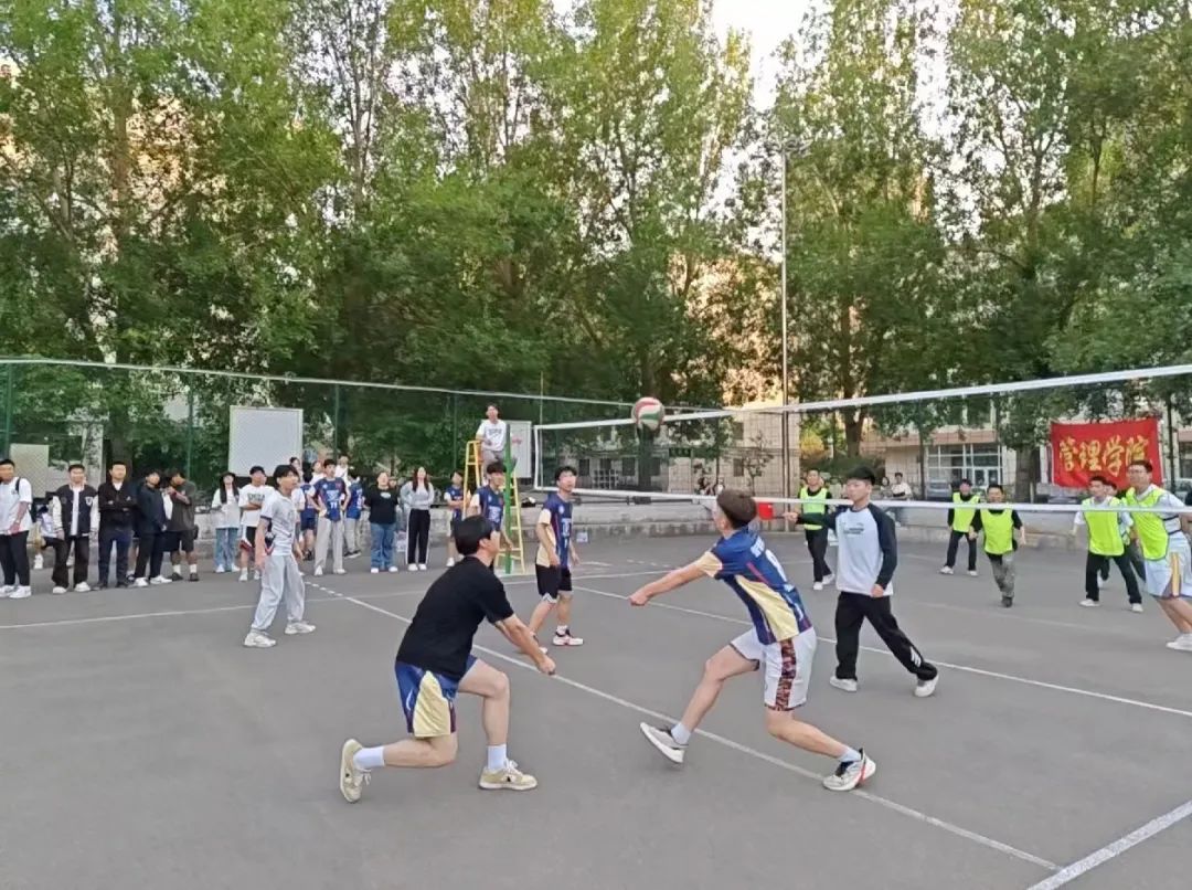 第一局比赛开始,会计学院二队球权,管理学院一队队员们迅速防起,二传组织三号位快攻,副攻队员眼神坚定,下手快准狠,将球定死在三米线内,管理学院一队的观众们高声欢呼,在欢呼雀跃中,管理学院一队的队员们拿下了第一局比赛!