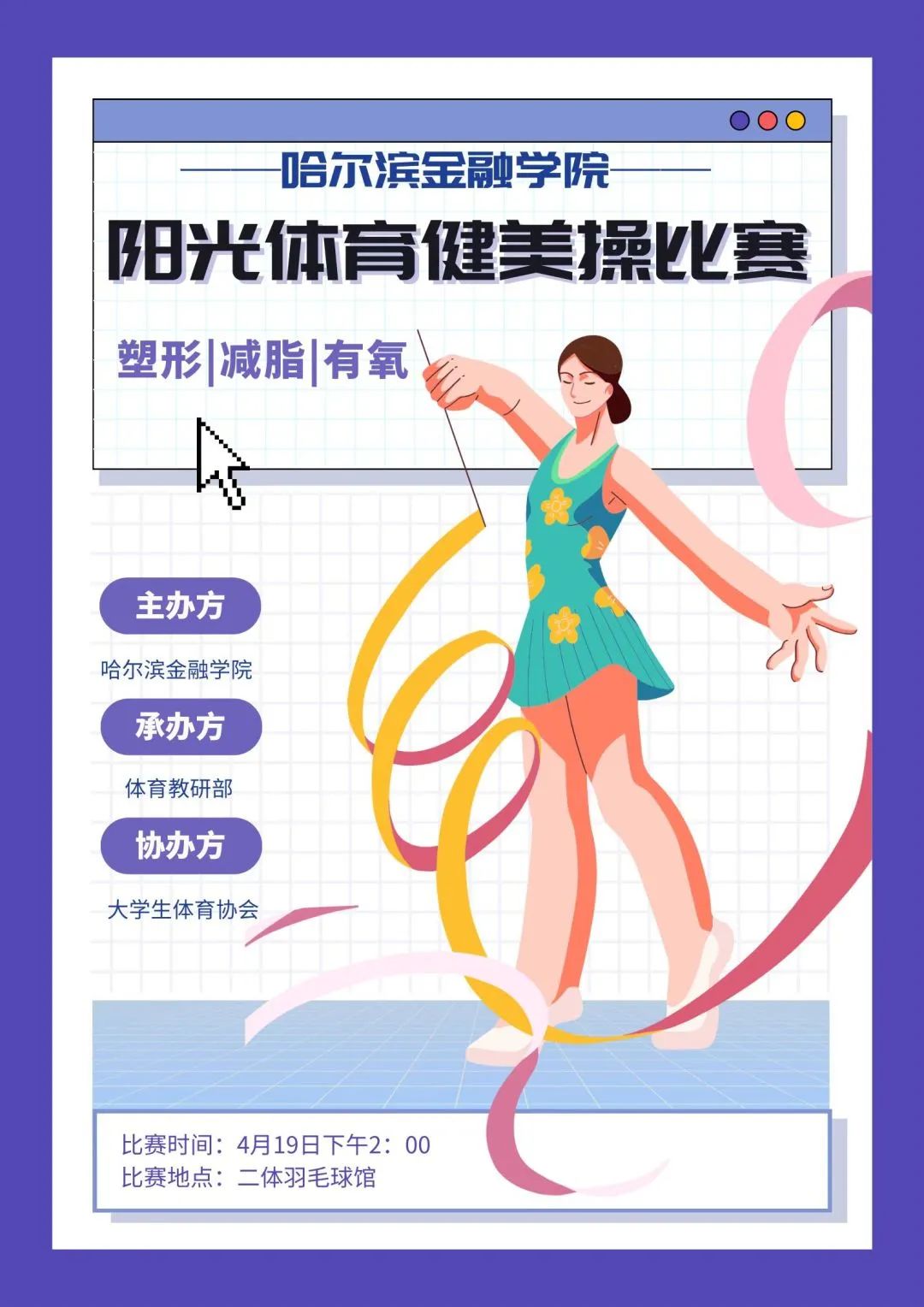 阳光体育竞赛健美操比赛将于4月19日在学院第二体育馆羽毛球馆举行,希望同学们持续关注,踊跃报名,积极参赛!
