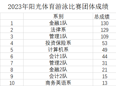 为全面提高学生体质健康水平,提升学院游泳运动氛围,按照《哈尔滨金融学院2023年“阳光体育”竞赛实施方案》整体安排,我院“阳光体育”竞赛游泳比赛于4月12日至13日在学院游泳馆成功举办。