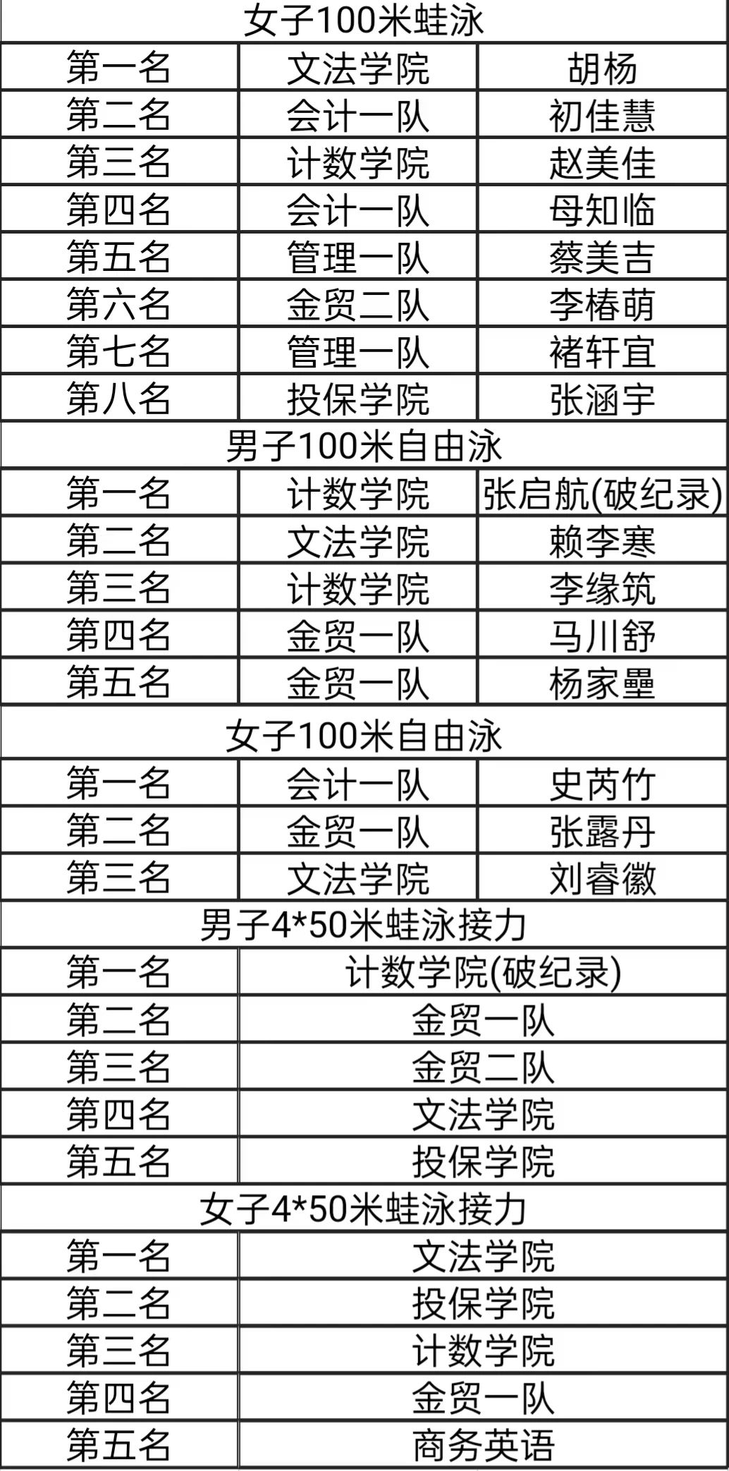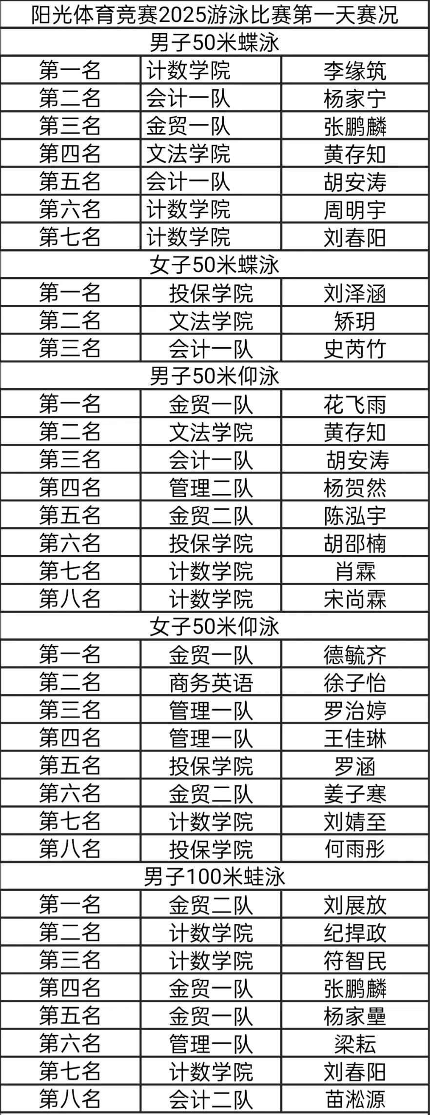 这场水上激战,不仅展现了选手们的超强实力,更见证了"更快、更高、更强"体育精神在金院学子身上的闪耀。从破纪录的惊喜到每一次全力冲刺,游泳健儿们用拼搏书写热血青春。期待在明天的比赛中,更多运动员能突破极限,在阳光体育竞赛的舞台上绽放耀眼光芒!