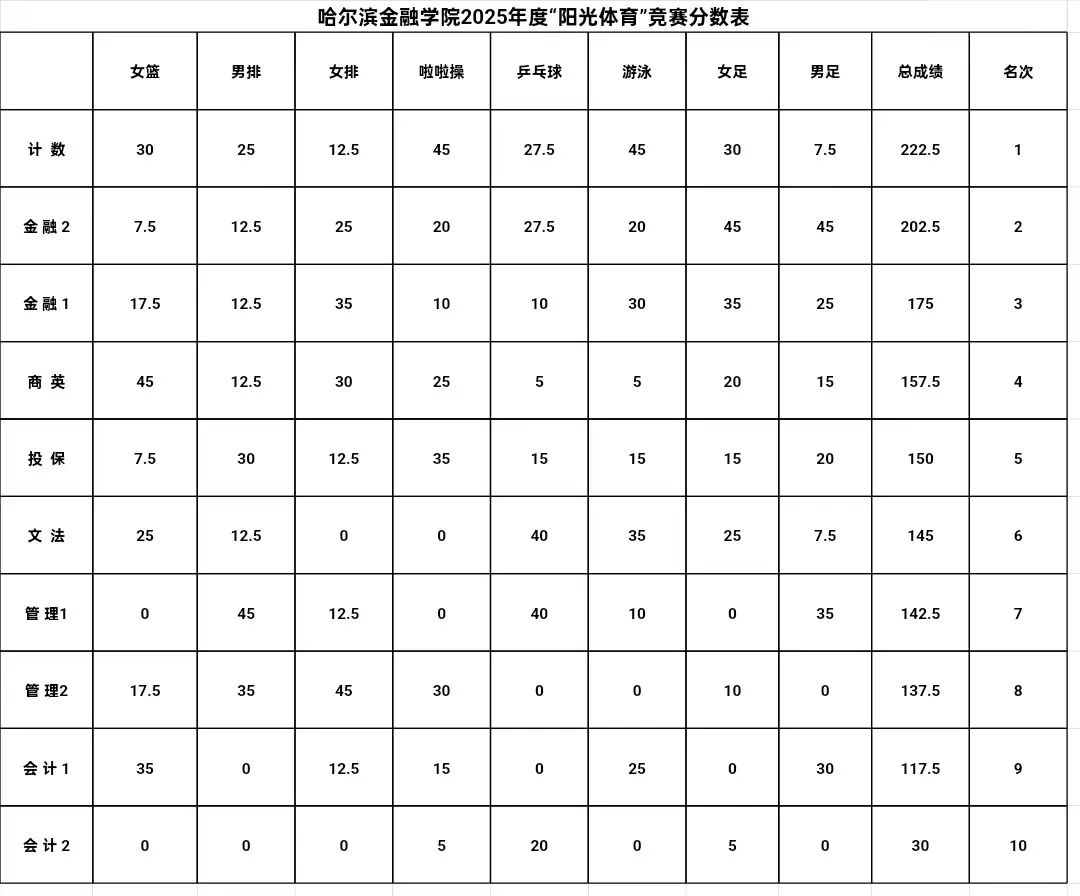 在上半程中,计算机与数学学院以222.5的成绩摘得魁首,金融与贸易学院二队以202.5分的成绩位列第二,金融与贸易学院一队以175的成绩名列第三。