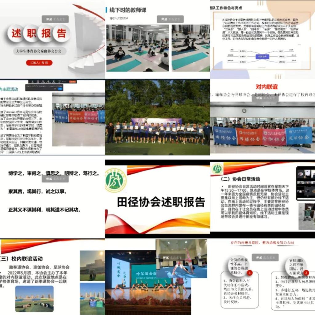 为总结经验,凝聚智慧,启发新思路,谋划分会未来工作蓝图,更好的密切各管理团队之间的交流与发展,提升大家的危机意识、责任意识和大局意识。根据《哈尔滨金融学院社团管理规定》和《大学生体育协会章程》,大学生体育协会于2022年5月29日下午三时三十分,在钉钉举行了2022年大学生体育协会分会述职评议大会。出席本次大会的有体育教研部副主任许宁老师、大学生体育协会总会和分会管理团队成员以及新一届管理团队成员参与,会议由大学生体育协会秘书长张瀚予主持。