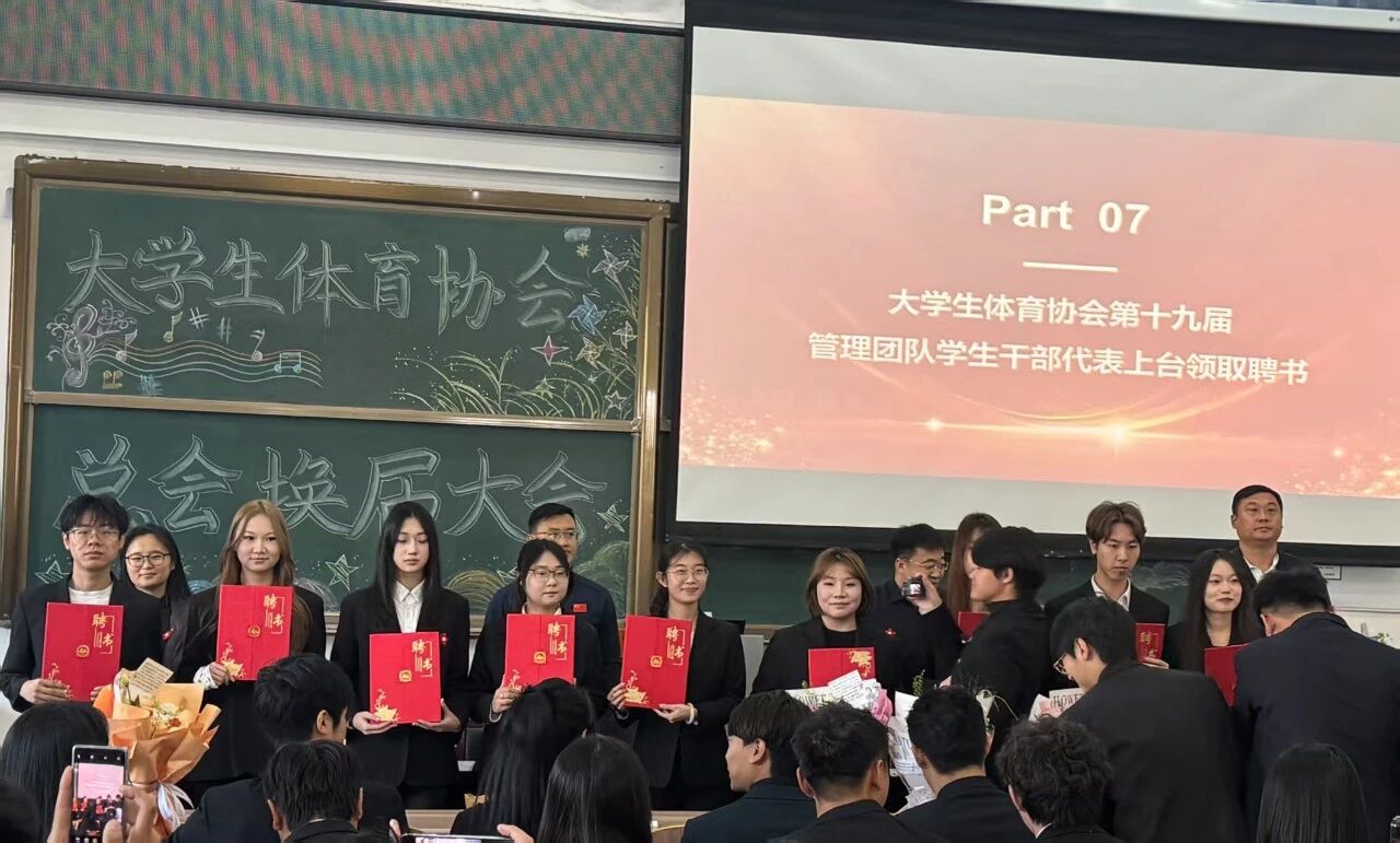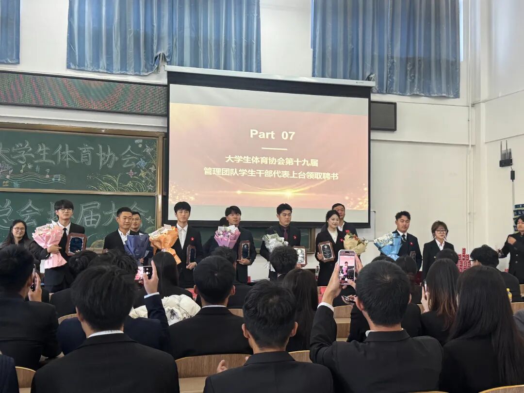 会议流程第十项由各位老师向大学生体育协会第十九届管理团队颁发聘书。