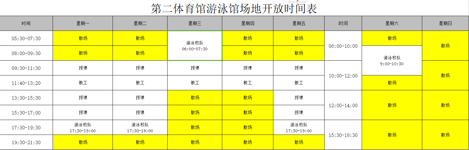 2023年秋季学期第二体育馆游泳馆场地开放时间表